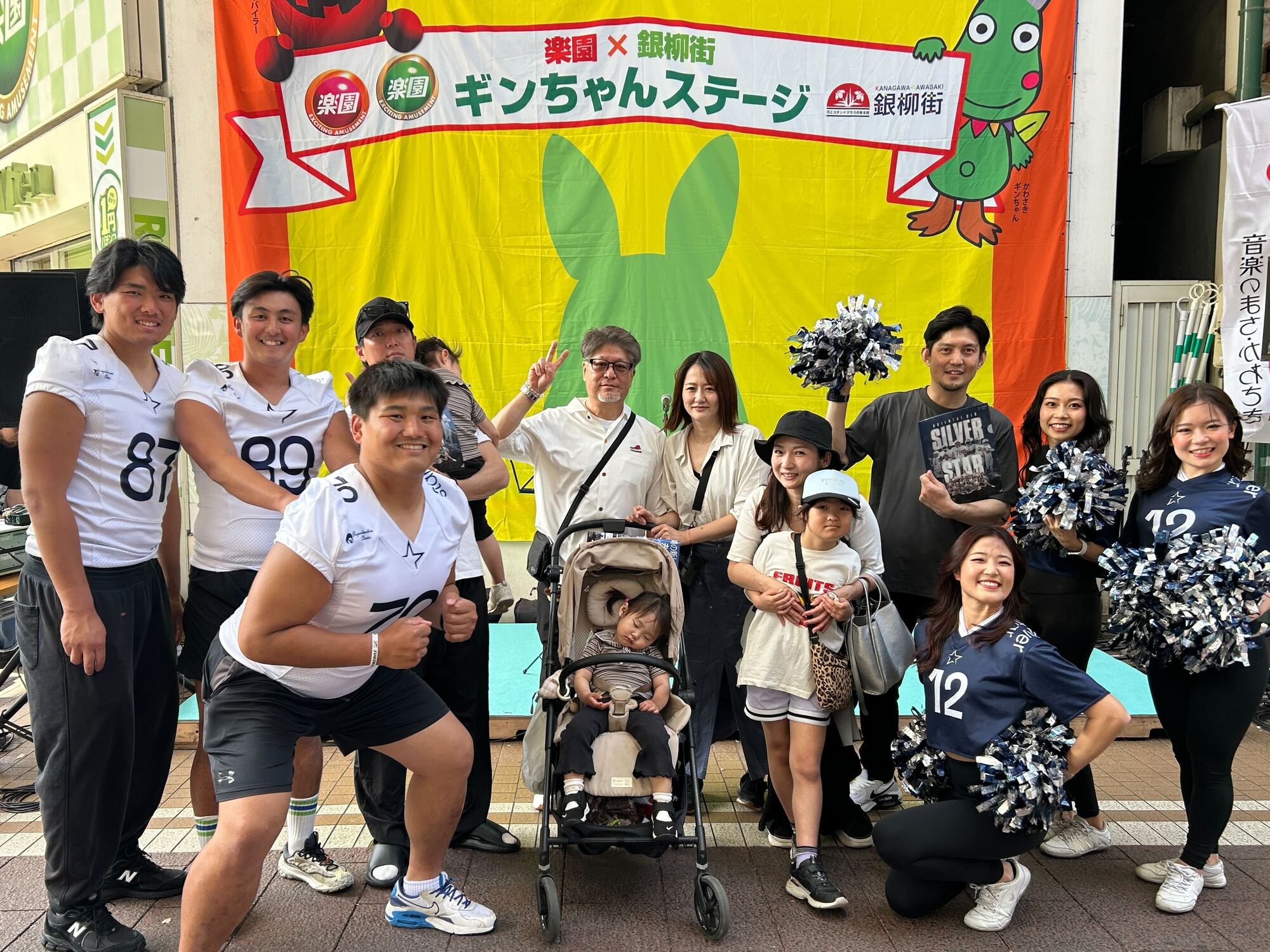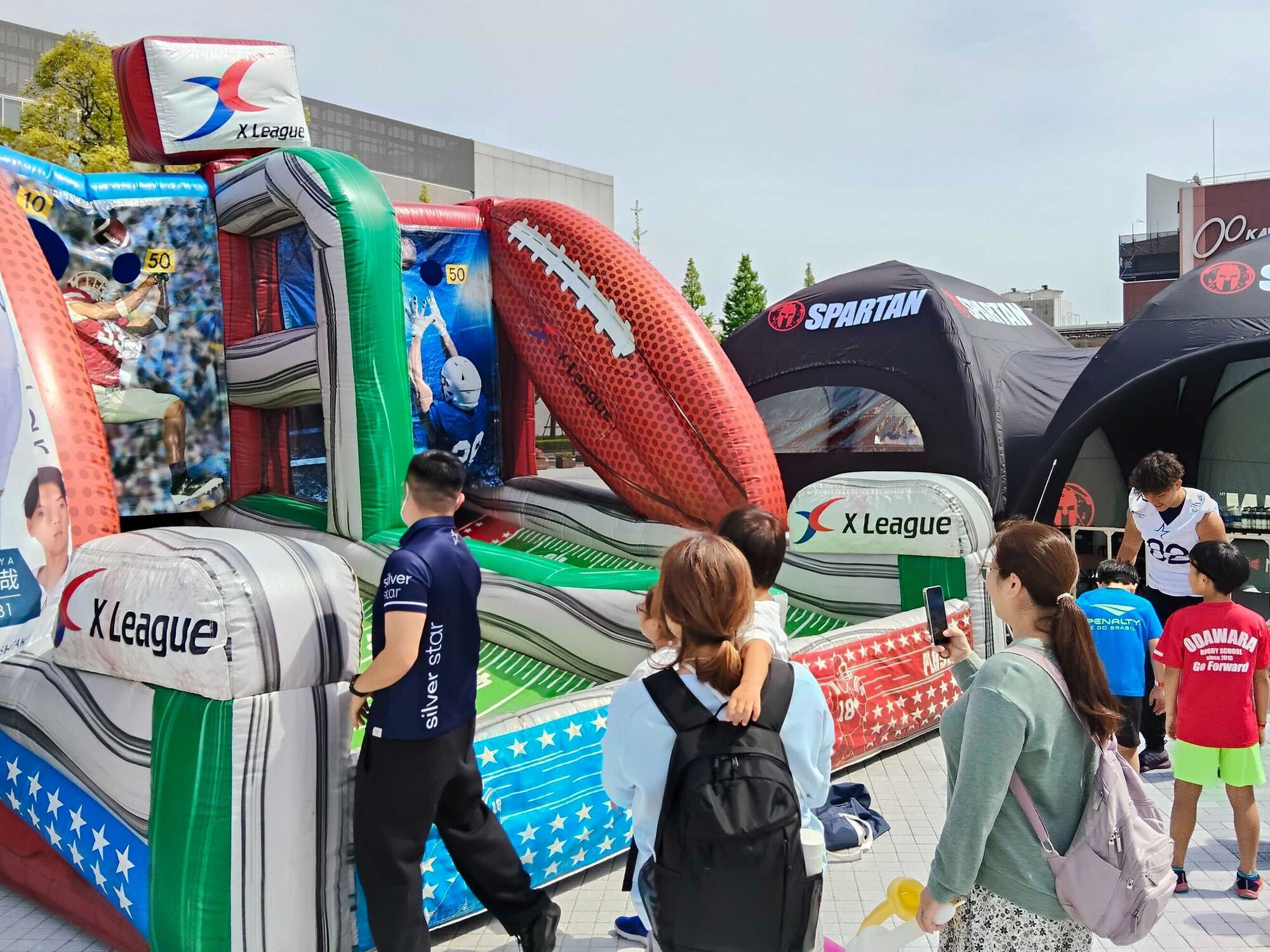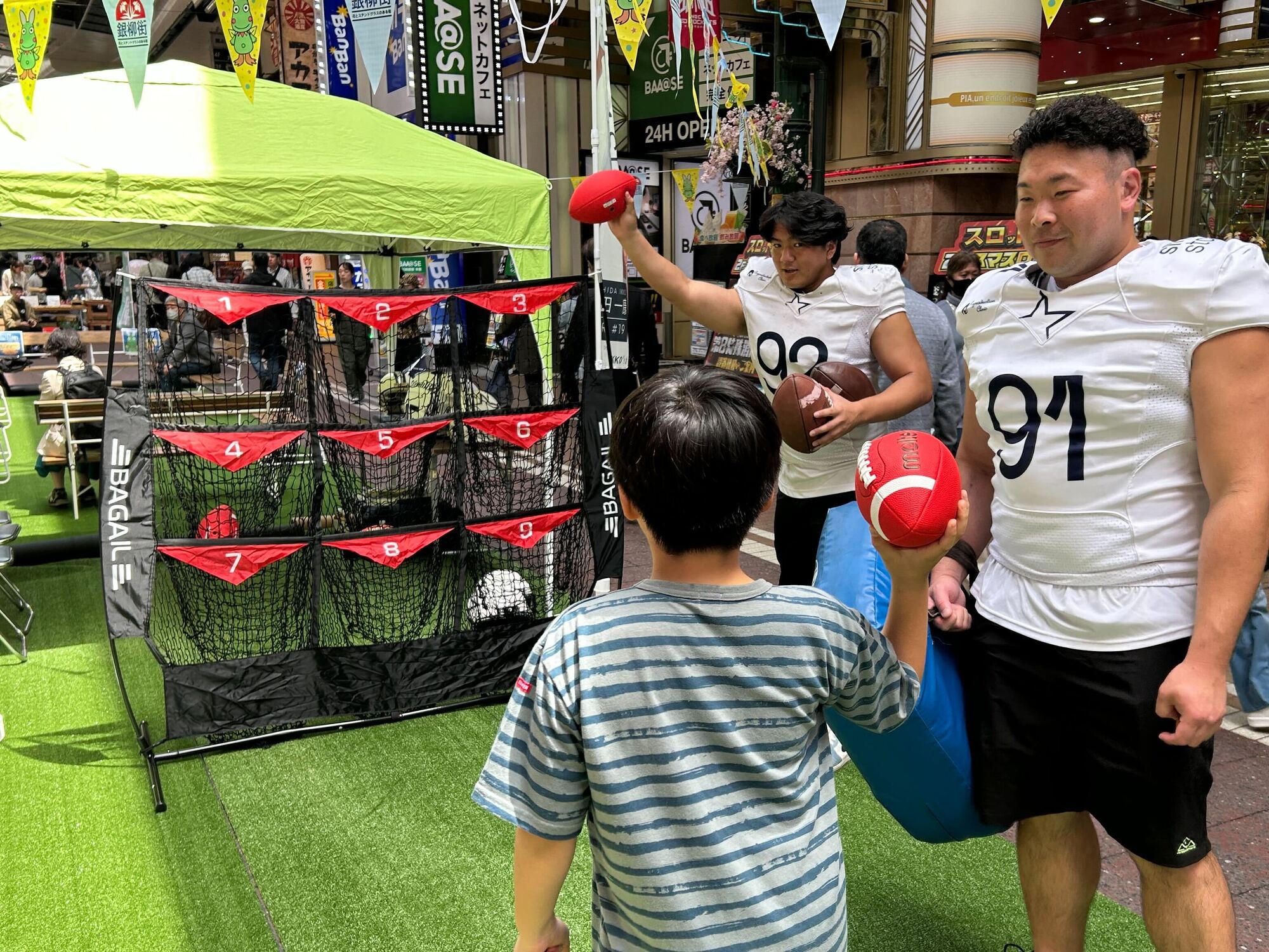 銀柳街商店街でのブースでは、アメフトボールを使ったストラックアウトやタックル体験、防具を着用しての写真撮影などを実施し、両日ともに多くの方にお立ち寄りいただきました。